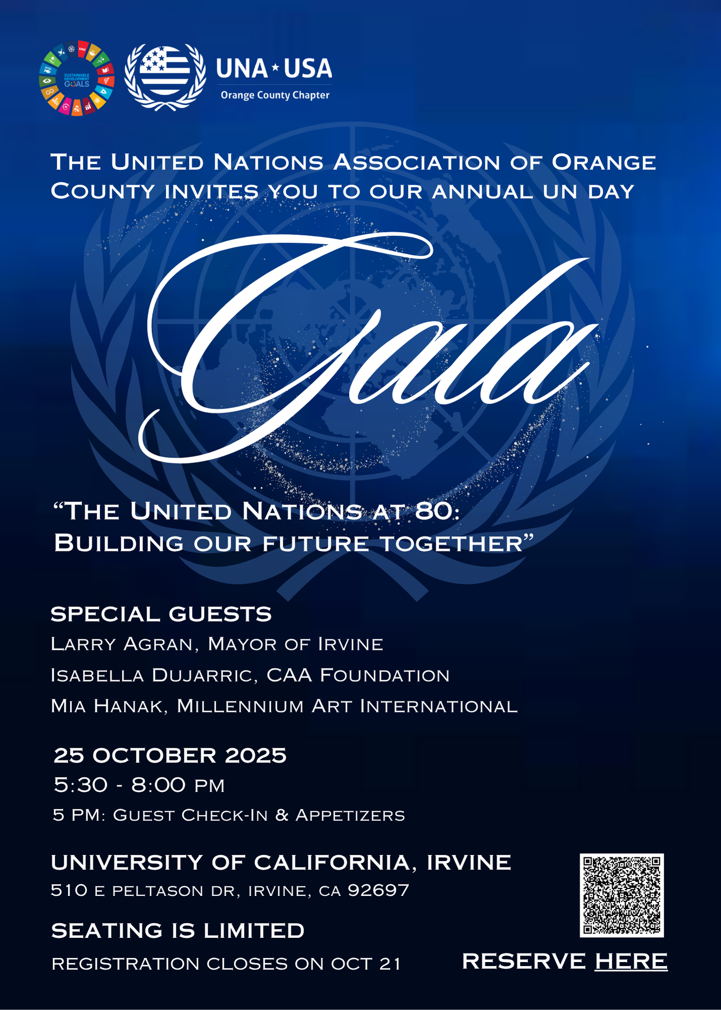 The United Nations Association of Orange County invites you to our annual UN Day Gala! This UN Day event will replace our usual monthly meeting. Register Here
