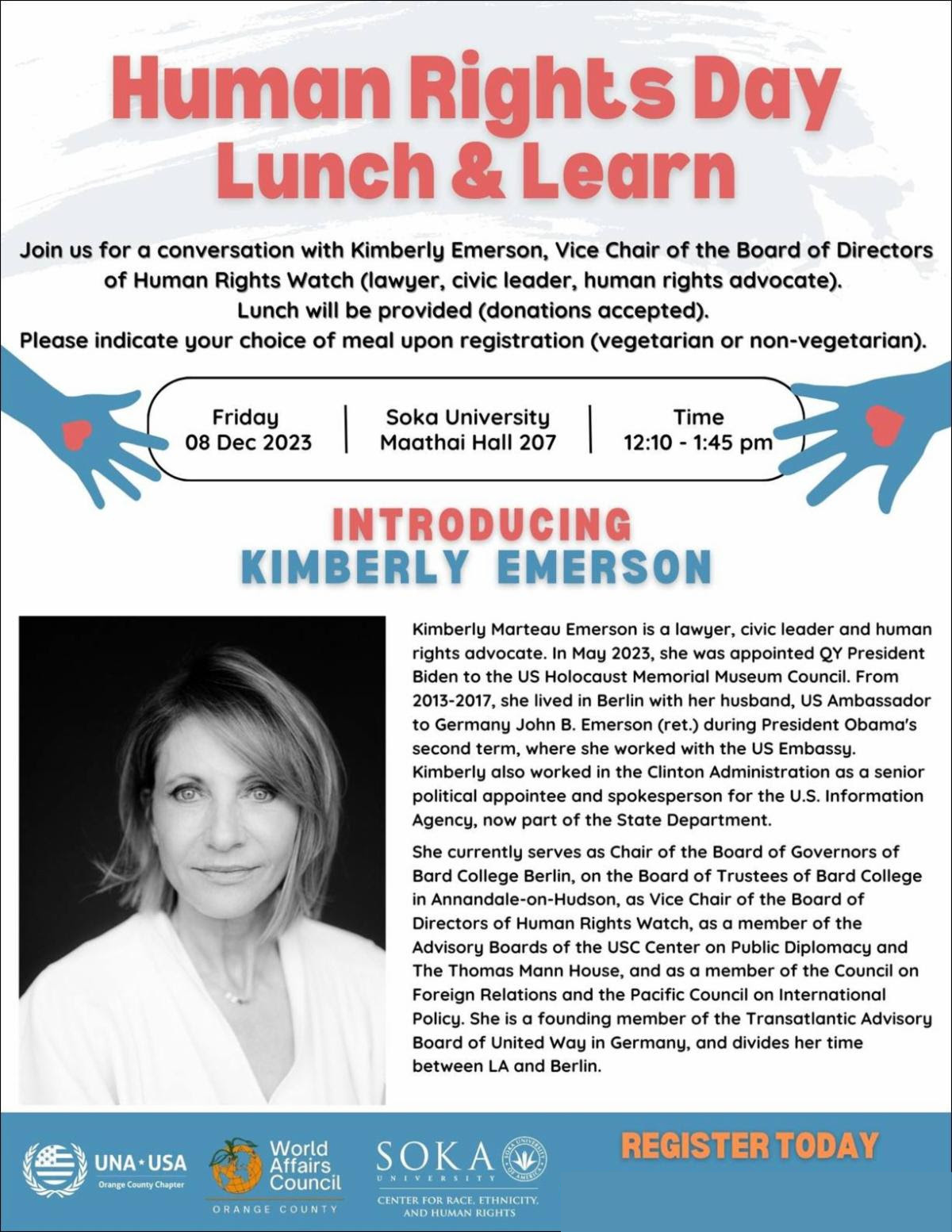 On Friday 12/8 - Come join us for a conversation with Kimberly Emerson, Vice Chair of the Board of Directors of Human Rights Watch (lawyer, civic leader, human rights advocate). This will be an informal conversation with the wife of the former US Ambassador to Germany, John Emerson. Lunch will be provided.