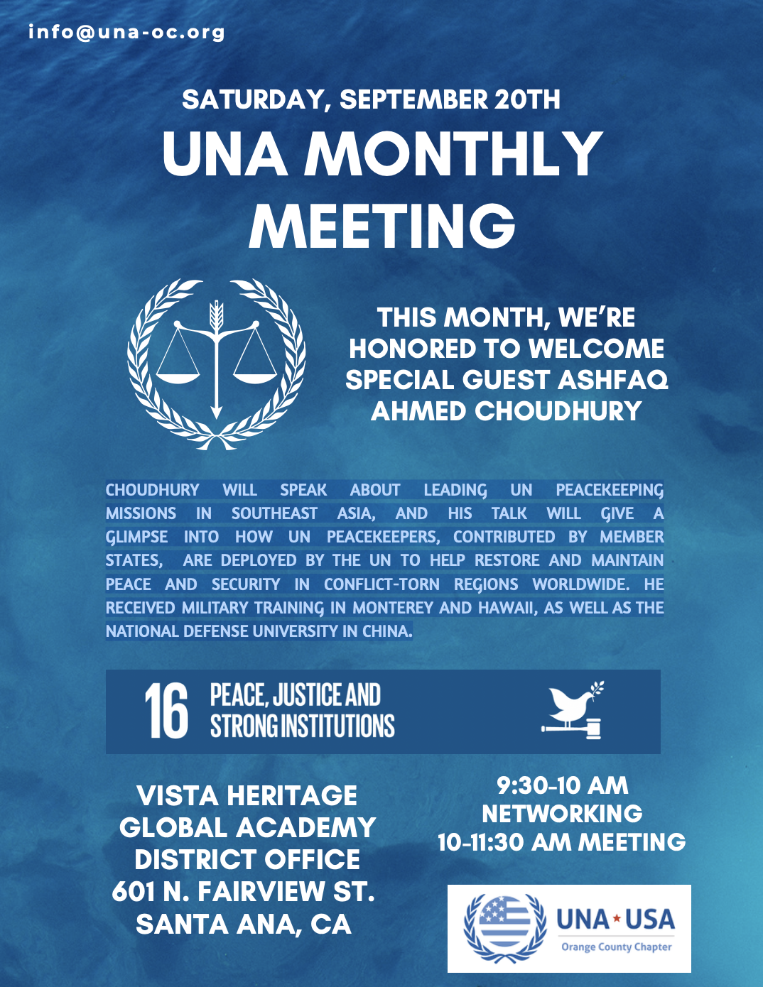 Join us to learn more about the great work UNA-OC and UNA, in general, are doing and how you might be able to get in involved. Let's figure out how we can make a difference to make the world a better place for all.