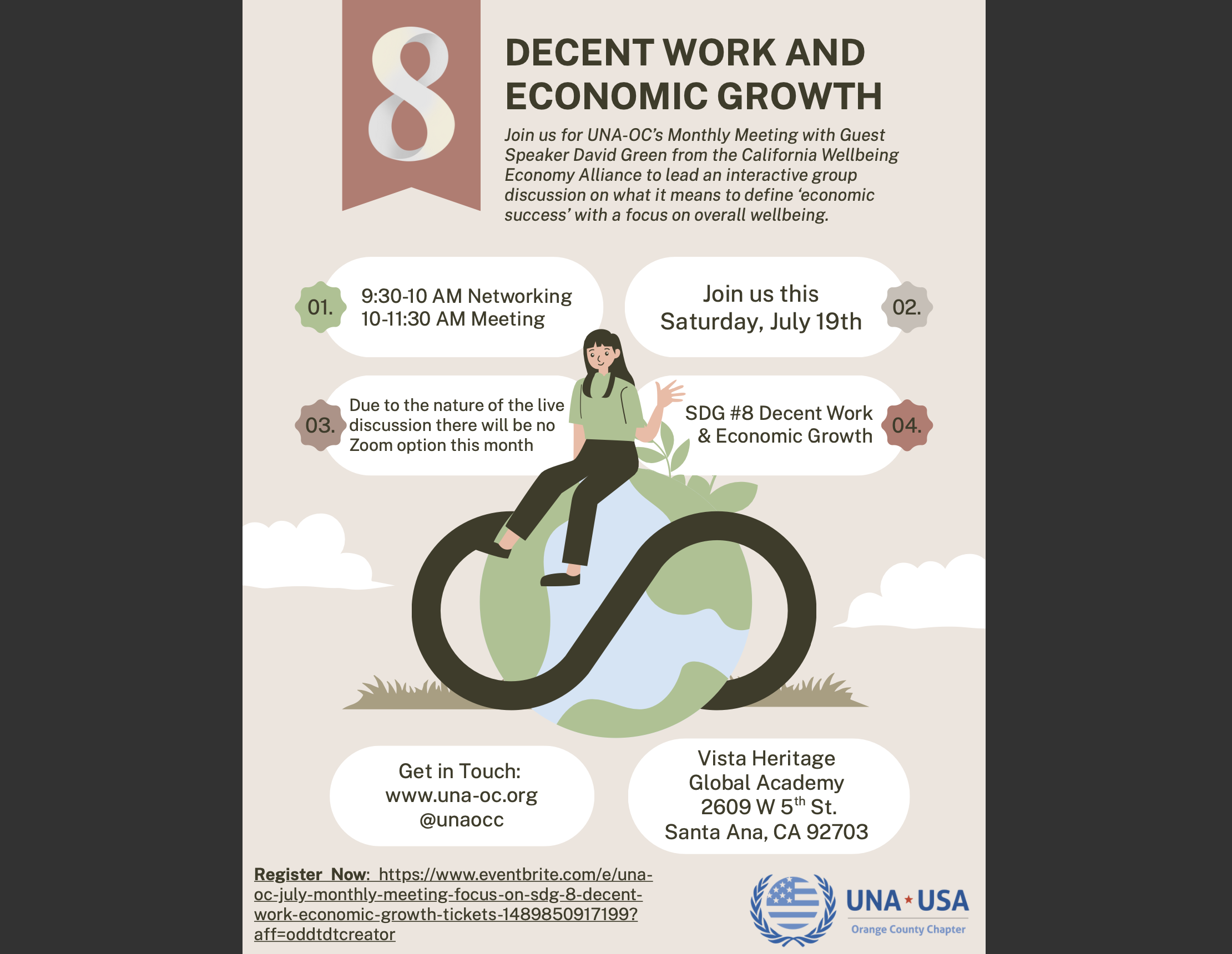 Join us for UNA-OC’s Monthly Meeting with Guest Speaker David Green from the California Wellbeing Economy Alliance to lead an interactive group discussion on what it means to define ‘economic success’ with a focus on overall wellbeing.